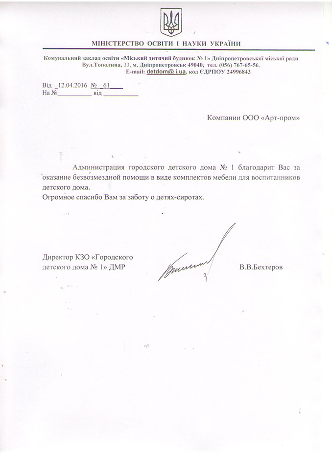 Наша компания активно принимает участие в благотворительных мероприятиях. Городской детский дом № 1 был снабжен комплектами мебели для воспитанников данного учреждения. Администрация детского дома выразила благодарность компании "Арт Пром" за оказанную помощь.