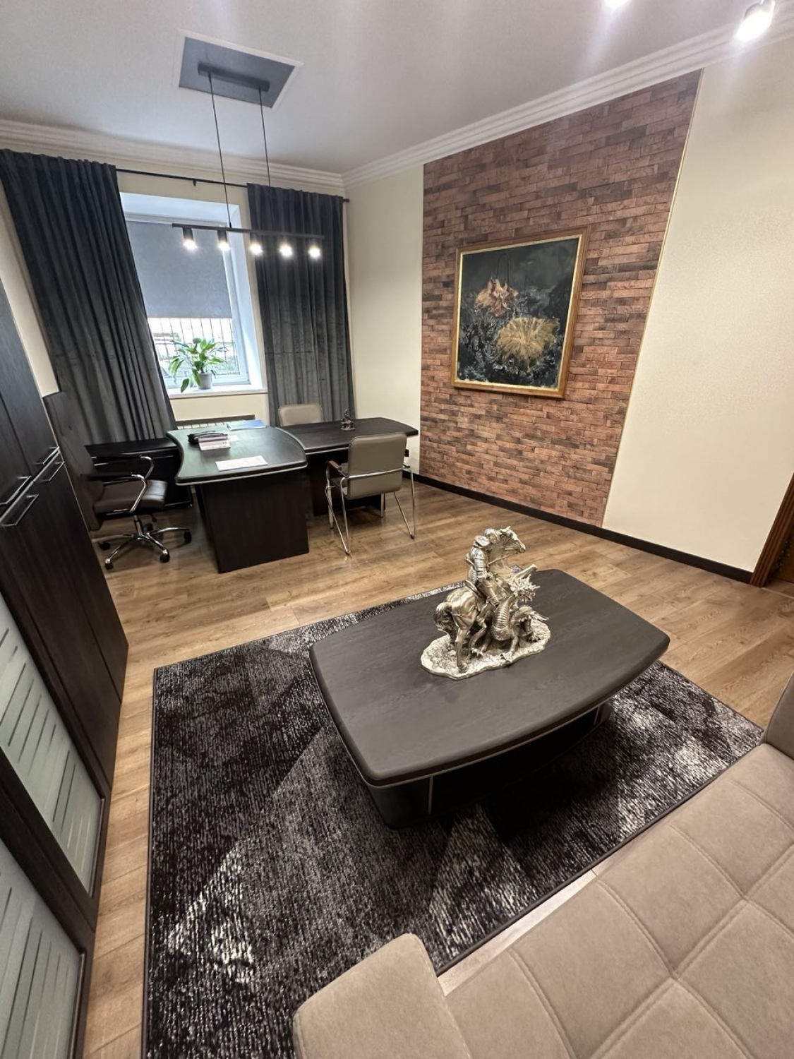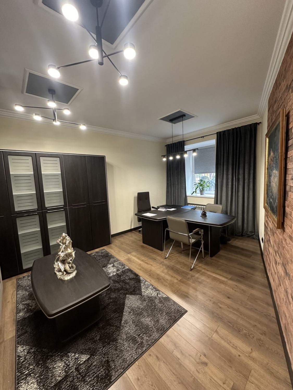 У 2024 році компанія AMF здійснила постачання та монтаж кабінету керівника у місті Київ. Кабінет призначений для проведення переговорів, зустрічей, співбесід та інших ділових моментів. Кабінет для керівника Онікс - поєднує в собі стильний дизайн, витримані лінії, кольори, строгість і сучасний стиль. Прекрасно підкреслює індивідуальність власника, статус та прагнення до продуктивної роботи. Меблі виконані з МДФ і ДСП покритих для більшої довговічності ПВХ плівкою. Фурнітура, доводчики, петлі використовуються фірми Samet, турецького виробництва, дуже високої якості, яка щороку випускає дедалі новіші та практичніші речі. Центральні замки на тумбах використані від всесвітньо відомого датського бренду Siso. Використання такої високоякісної фурнітури гарантує надійність усіх механічних та рухомих частин меблів.