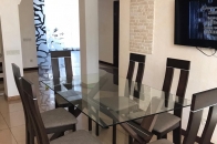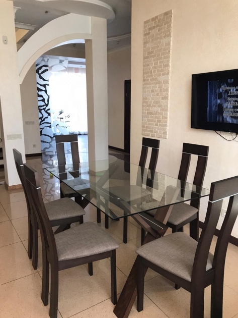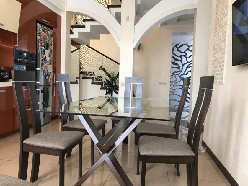 Для оформлення обідньої зони використано стіл Лаура з каркасом з натурального дерева та скляною стільницею. Завершують тандем дерев'яні стільці Лестер з сидінням з тканинної оббивки.