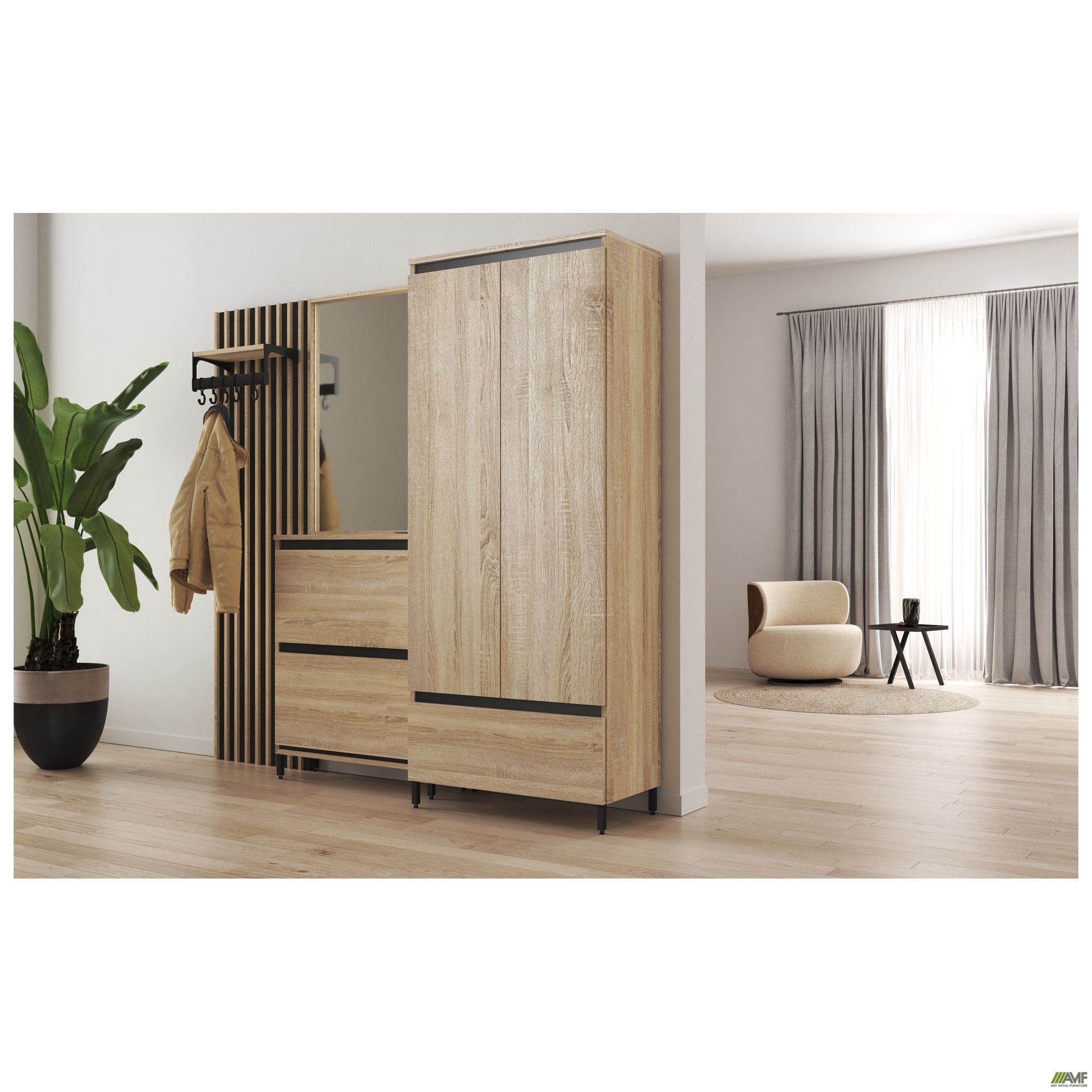 Колекція корпусних меблів AMF Welcome створена спеціально для облаштування житлових приміщень та передпокоїв. Усі модулі з колекції поєднуються у різноманітних тандемах та чудово доповнюють один одного. Модулі оснащені металевими ніжками, покритими порошковою фарбою. Вироби виготовлені з ламінованої плити ДСП, товщиною 16 мм. У колекцію корпусних меблів AMF Welcome входять всі необхідні модулі для облаштування передпокоїв, завдяки чому можна підібрати варіанти для оформлення саме вашого інтер'єру.